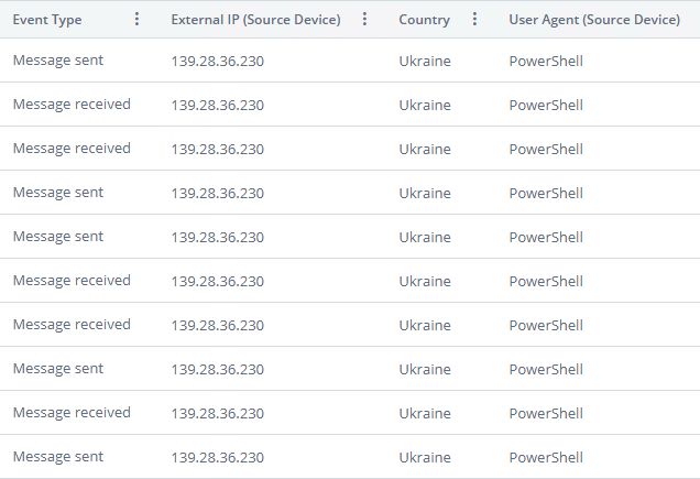In one notable instance, an alert was triggered by activity originating from a Ukrainian IP address. This was an unusual and unexpected location for the affected tenant. Unlike typical geolocation-related alerts that coincide with login attempts, this incident involved no authentication activity at all. Only outbound email traffic was observed.