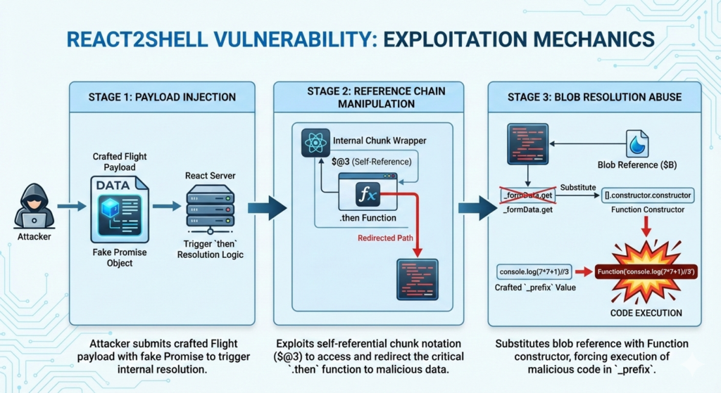 Stage 3: Blob Resolution Abuse React Flight uses blob references (prefixed with $B) to handle non-serializable values. The exploit substitutes _formData.get with [].constructor.constructor—effectively creating a reference to the Function constructor. Combined with a crafted _prefix value containing executable code, this forces React to invoke: